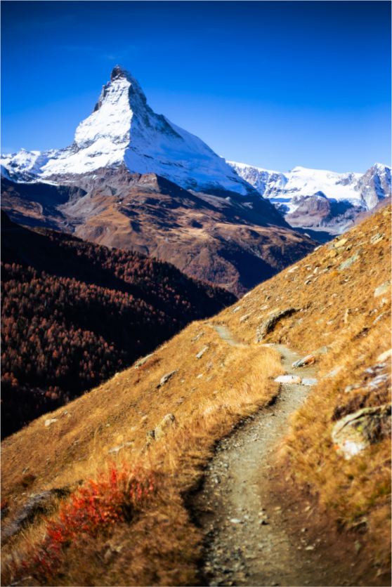 Herbstlicher Spaziergang durch die Lärchenwälder bei Zermatt. Die Sonne scheint und das Matterhorn, der wohl bekannteste Berg der Schweiz, präsentiert sich in hellstem weiß. Ort: Zermatt, Schweiz Fotograf: Jonas Wagner-Mörsdorf Kamera: Canon 6D Nachbearbeitet mit Adobe Lightroom